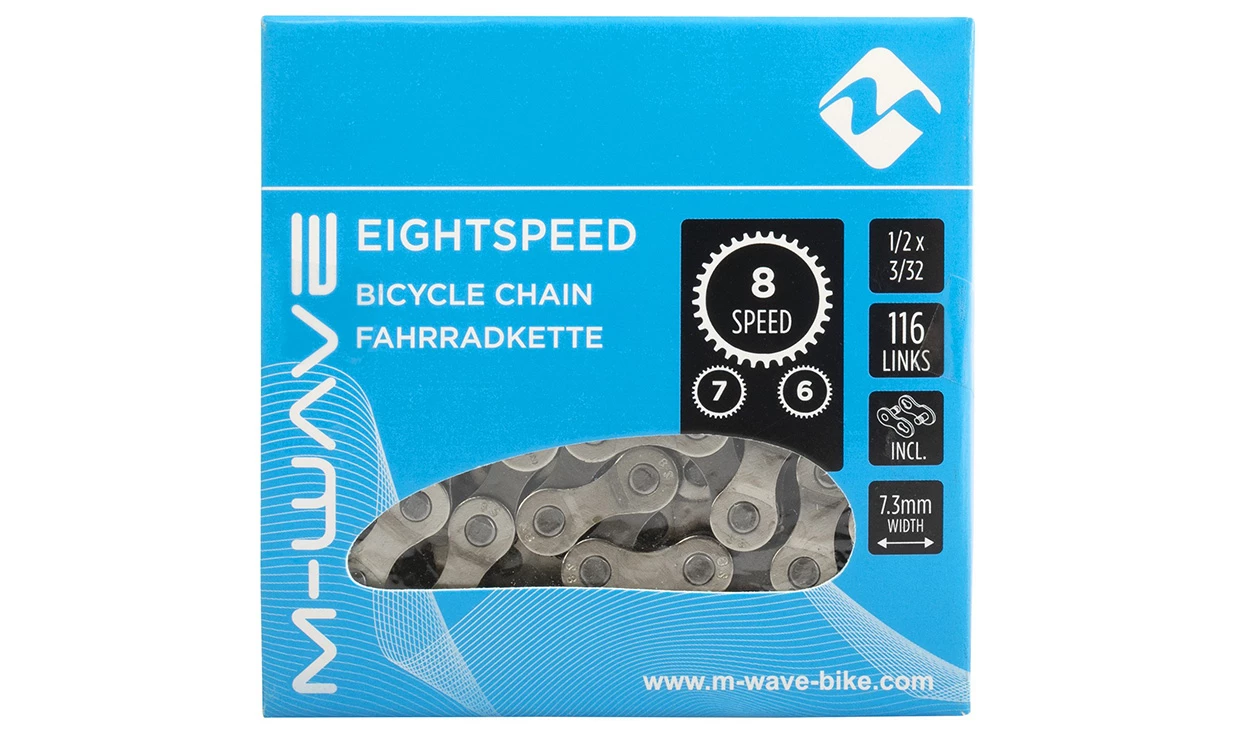 La chaine vélo M-Wave est une chaine performante, composée de 116 maillons de pas 1/2 et largeur 3/32 pouces. Elle se ferme par un maillon à attache rapide fourni.
