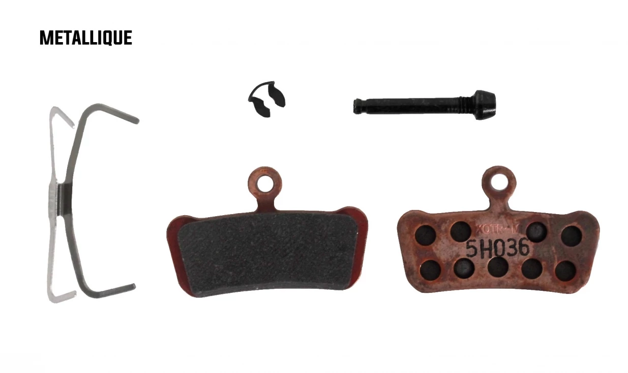 – Les plaquettes métalliques (agrégat de particules métalliques fortement compactées) possèdent un bon freinage par toutes conditions, une très bonne longévité et supportent mieux les montées en température que les plaquettes organiques. A privilégier dès que vous empruntez de longues descentes ou que le terrain est boueux.