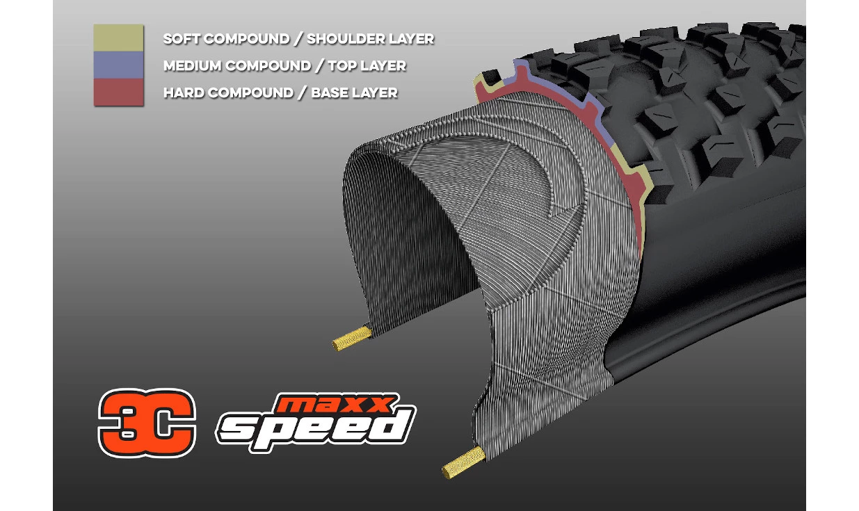 • Technologie Triple Compounds. Gomme 3C Maxx Speed utilisée principalement en Cross Country, spécialement conçue pour réduire la résistance au roulement, optimiser la traction et augmenter la longévité du pneu.